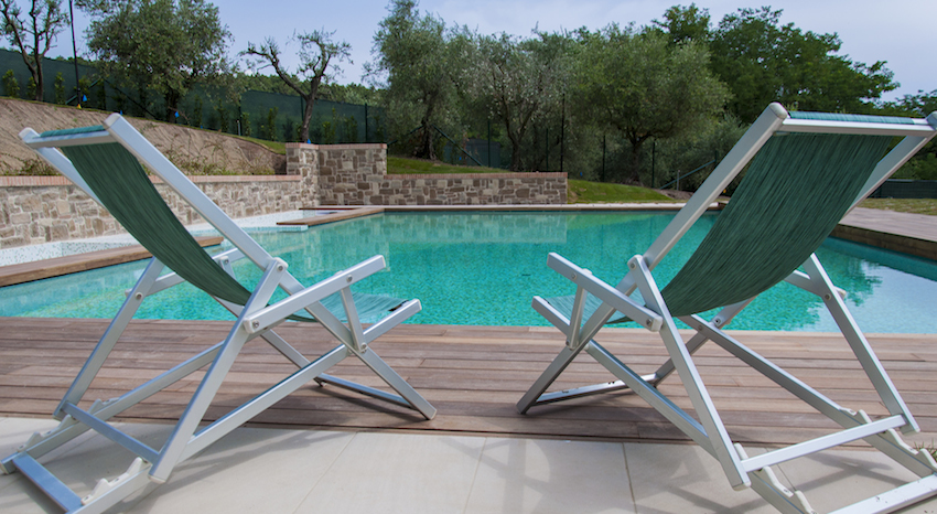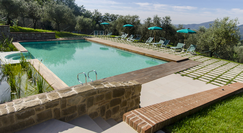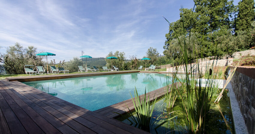 The villa is suitable for both family holidays, groups of friends and couples. Here are large outdoor areas in flat terrain. The area the villa is located in is considered one of Lucca’s best neighborhoods. Swimming pool (8x14m, depth 1.40m) with sun loungers. The pool is open May – Sep. Opening it for other periods upon inquiry. Semicircle in the pool with stairs down into the water is popular for the little ones. Some apartments have doors leading to common patio areas with tables and chairs. The Ludovico apartment is the only one of these that has its own small outdoor area outside one of the bedrooms with table and chairs. But none of the apartments have their own private patios / seating areas. All apartments have access to their own table, chairs and parasols in the large communal garden. Here you can enjoy breakfast, lunch and dinner outdoors with wonderful views of the countryside. Large car park. About 40 min drive from the coast.