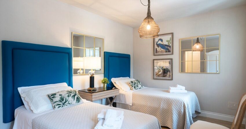 Andre etasje: 2 hovedsoverom med terrasser og egne bad, 1 tomannsrom med bad.